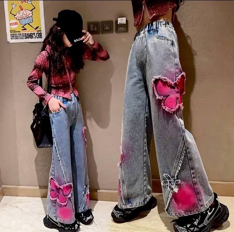 🦄Новинка,модні джинси палаццо для дівчат. Стильний дизайн , сердечка нашивка +рожева окраска. Добре тягнуться , зручні в носці . 🦄Розміри: 130(4 шт) 140(7 шт) 150(5 шт) 160(5 шт) 170(5 шт) 🦄Заміри: 130:Довжина 77,крок 51,пояс 23 см. 140:Довжина 81,крок 55,пояс 24 см. 150:Довжина 87,крок 61,пояс 25 см. 160:Довжина 91,крок 63,пояс 26 см. 170:Довжина 96,крок 69,пояс 27 см. Орієнтація на заміри ,допускається похибка в 1-2 см. Ціна:680 грн🦄