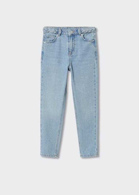 Джинсы с плетеным поясом. Хлопковая ткань в джинсовом стиле. Прямой дизайн. Пять карманов. Застежка-молния и застежка на одну пуговицу. Плетеный пояс.