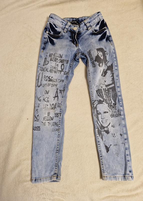 Джинси для дівчинки підростка з оригінальним принтом.Заміри: ПОТ- 26см, ПОБ - 37см, посадка- 16см,довжина- 73см.Стан нових!