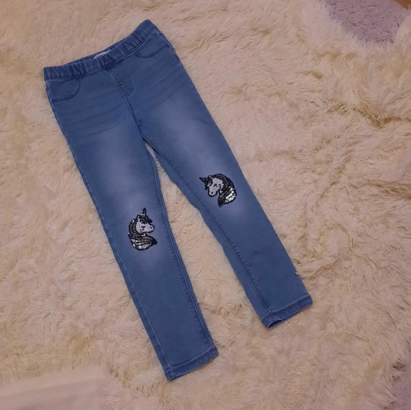 Джинсы на девочку, размер 122й (на 5-6лет), прямого кроя. Пояс на резинке, декорированы рисонком из пайеток на коленях. Состояние идеальное. Замеры: Длина: 70 см Ширина 27 см (на резинке) Шаг: 50 см