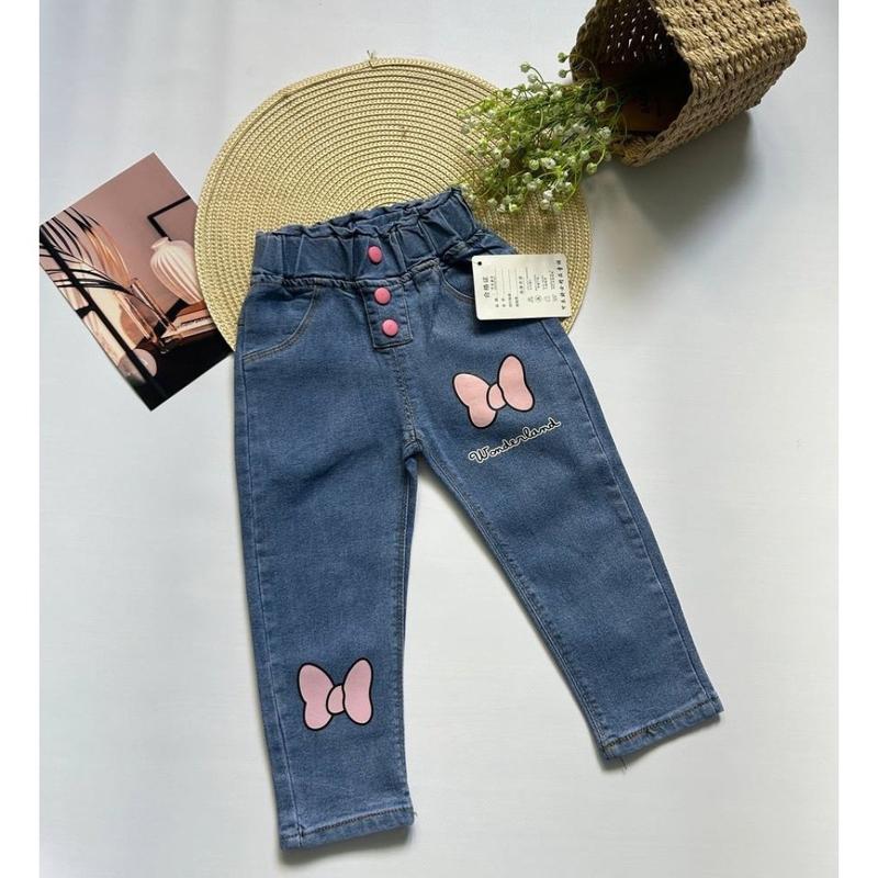 ===РОЗМІР 100=== довжина 57 см кроковий 34 см стегна 34 см ===РОЗМІР 120=== довжина 68 см кроковий 42 см стегна 35 см Фасон: вільний крій у стилі Mom – тренд, що забезпечує свободу рухів Посадка: висока талія для зручності та гарного силуету Пояс: еластична резинка, що легко адаптується до фігури Матеріал: якісний денім, приємний на дотик та довговічний Колір: світло-синій – універсальний і стильний Кишеньки: зручні задні кишені для дрібничок Родзинка моделі: на штанинах милий малюнок бантиків, що додає ніжності та грайливос