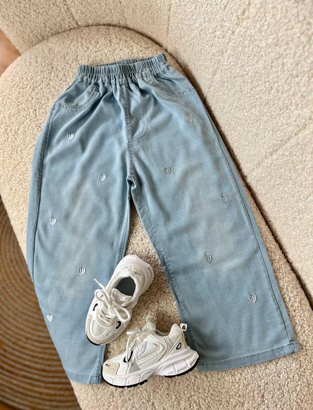 Джинси для дівчаток Легенькі джинси у дуже гарному кольорі Легкий джинс-котон, ідуть вільного крою, тканина мяка та приємна на дотик Чудовий варіант на весну та літо Орієнтуйтеся на заміри, розміри пишу по бірці! 120 - довж 69см крок 43см бедра 43см 130 - довж 73см крок 47см бедра 47см