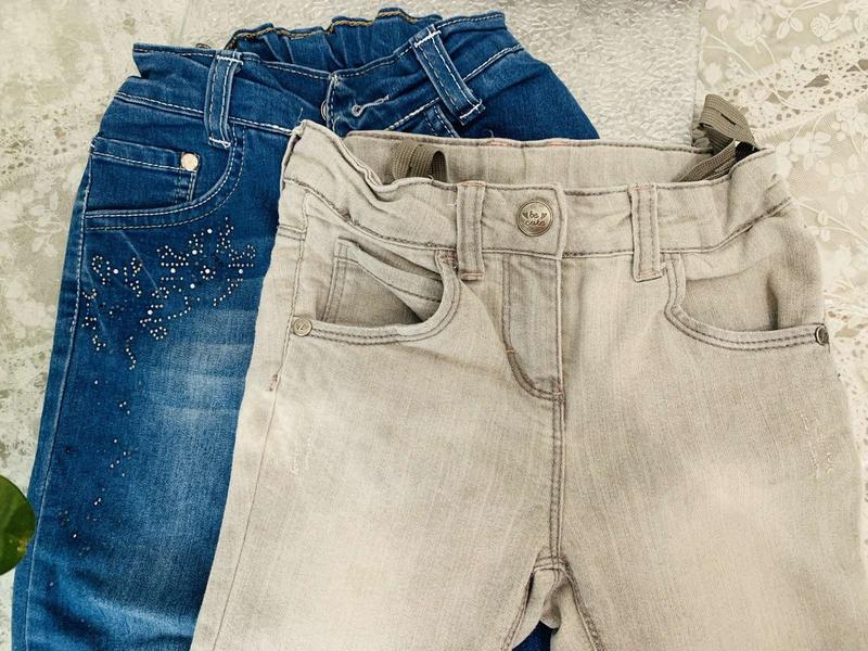 Сині йдуть на гумці, сірі на клямці. Легко вдягаються, Тканина у джинців – стрєч, тягнуться добре. Скрізь є кормани, як попереду, так ззаду. ■ Сірі джинци👇 - довжина: 68 см. - резинка: 26 см. - бедра 30 см - від матні до ніг: 47 см. ■ Сині джинци на дівчинку👇 - довжина: 67 см - резинка: 25 тягнуться - бедра: 34 см - від матні до ніг: 47 см. Два по одній ціни.