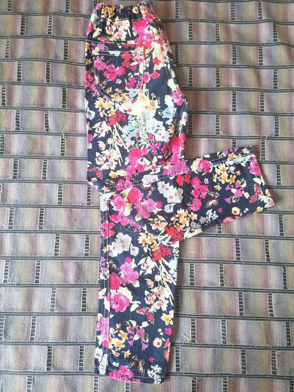 Літні джинси для дівчинки з квітковим принятом. ПОТ 25СМ +РЕЗИНКА, ДОВЖИНА ВІД ПОЯСА 72СМ.