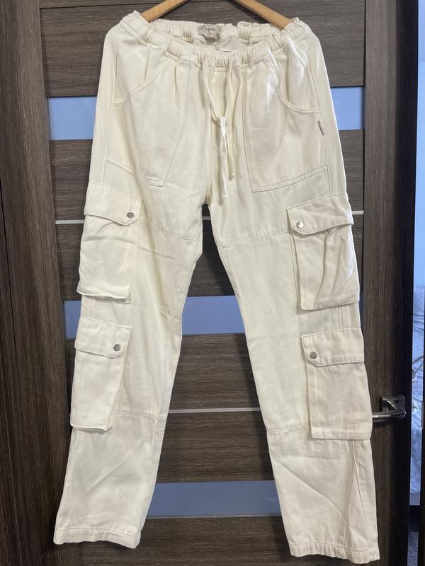 Джинси Германія, нові, бежевого кольору з кишенями, на резинці категорія вказана неправильно, довжина-110 см, напівобʼєм поясу-40-50 см, в бедрах-58 см, в колінах-26 см, внизу-22 см, покроковий-84 см, висота посадки-27/38