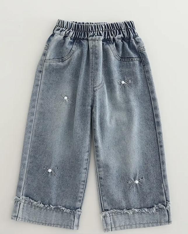Джинси палаццо Мʼякий денім з ефектом "washed" Вишиті бантики з перлинками Зручна резинка на талії Краї злегка бахромисті Розмір: 92, 98