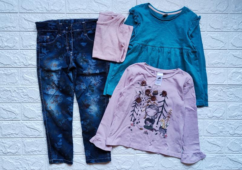 Комплект речей на дівчинку в чудовому стані. Бірюзовий реглан йде в подарунок, має малопомітну пляму, вказала на останньому фото. Заміри штани ( тоненькі котонові): довжина _62 крок_43,5 поп_28, регулюється резинкою Пудровий реглан з малюнком: довжина _38 рукав _38 Бірюзовий реглан: довжина _41 рукав _39 майка довжина _37