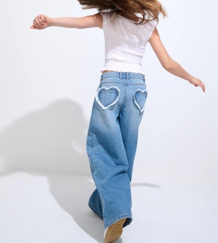 Фірмові широкі джинси. Середня посадка, мереживо, мармуровий ефект, дві кишені спереду та дві ззаду. Розміри: 140-164 (уточнюйте наявність) Матеріал: 100% бавовна