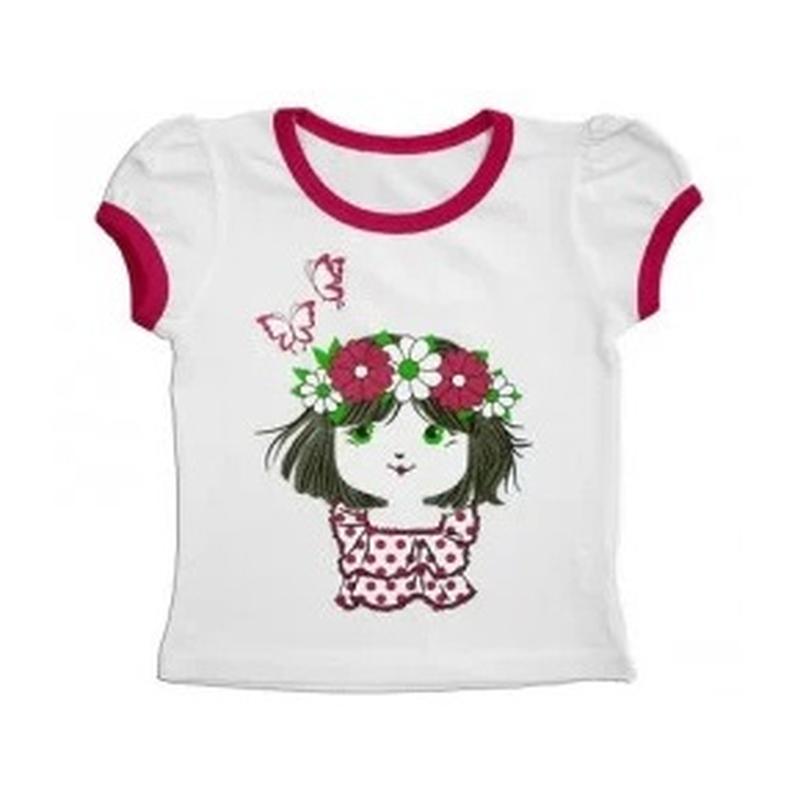 Літня футболка для дівчинки з якісного легкого трикотажного полотна, рукави і горловина оброблені бейкой контрастного кольору. Оформлена ніжним принтом. Добре виглядає з спідницями з нової колекції. Колір: Білий; Полотно: Стрейч-кулір; Склад: 95% бавовна, 5% еластан; Оформлення: Пряма трансферна друк (накат); В наявності ріст 104, 110, 116, 122.
