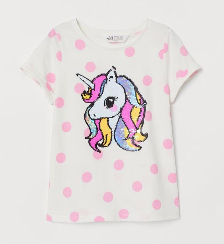 Яскрава горохова футболка H&M з аплікацією з реверсних паєток. Популярний принт-єдиноріг.