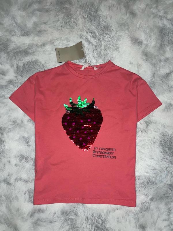 Футболочка с клубникой Пайетки перевертыши 🏷Mango 🔹6 лет (2) Длина 39. ПОГ 34 🔹7 лет Длина 41. ПОГ 36