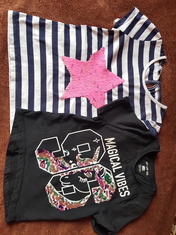 В ідеальному стані продам чорну футболку на дівчинку. Заміри довжина від плеча до низу 43см ПОГ 31см. В смужку, є нюанс на фото показала. Заміри довжина від плеча до низу 46см ПОГ 33см. Ціна за одиницю, якщо в одні руки, віддам за 90грн.