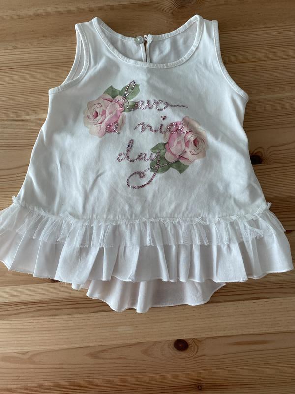 Туніка літня - розмір по бірці 12 м , можна носити раніше і пізніше Спереду коротша , позаду довша дуже гарна , пасує під любий низ, не вистачає 3х камінців Довжина 32 Позаду 36 Плечі 18 Груди 25