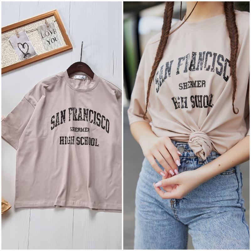 Футболка SAN FRANCISCO оверерсайз з трендовим накатом Тканина-кулір гарна якість ПОВНОМІРНА 140(1 шт)-довжина футболки 53,пог 53 146(1 шт)-довжина футболки 57,пог 54 152(1 шт)-довжина футболки 60,пог 55 158(немає)-довжина футболки 62,пог 57 164(1 шт)-довжина футболки 65,пог 59 +-2 см