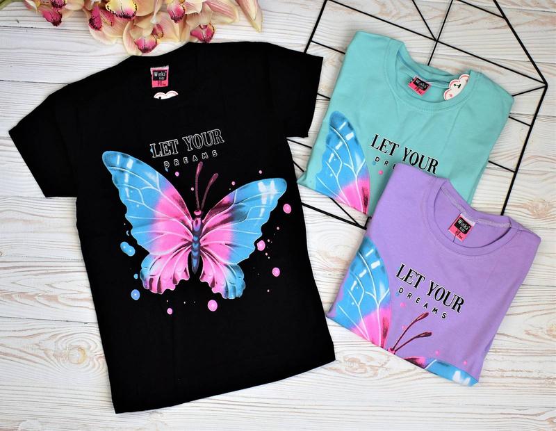 Футболка "Метелик" Опис ✅Вир-во: Туреччина ✅Тка-на: Бавовна. ✅Додатково: принт, накат ✅Заміри: довжина/ширина. 128см-47/31 134см--49/33 140см-51/35 146см-54/37 152см-57/39 ✅Можлива похибка у вимірах +- 1/2 см
