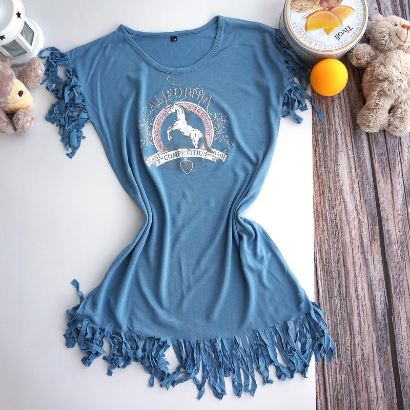 Ніжна віскозна туніка з оригінальними краями та принтом на грудях. Докладніше дані про модель у сантиметрах: Склад тканини: віскоза 100% Сезон: літо Бренд (ТМ): Quelle Вік 10 років (блакитна): довжина виробу 63 см, напівобхват грудей 34-43 см, напівобхват стегон 42-48 см. Розпродаж — обміну та повернення немає. Через різні параметри монітора відтінок на світлині може відрізнятися.