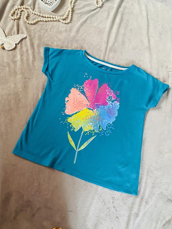Стильна яскрава футболка GAP, вільного крою. Стан ідеальний. Розмір 134 (8-9 років), але найкраще орієнтуватись на заміри. Довжина по спинці 48,5 см. ПОГ 43 см. Дод. фото та заміри на вимогу.