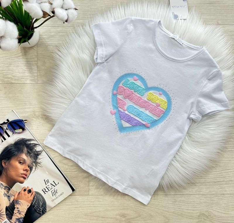 Базова трикотажна футболочка 😍 з яскравим обʼємним принтом 🩵💜🩷💛 Тканина: трикотаж (95% cotton 5% spandex) Виробник: S&D KIDS 🇪🇺 ЗАМІРИ ⤵ +/- 1-2см!!! ◾98- довжина 39см / ПОГ 29см. ◾104- довжина 40см / ПОГ 30см. ◾110- довжина 42см / ПОГ 31см. ◾116- довжина 44см / ПОГ 32см.