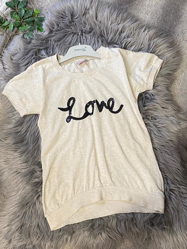 Футболка на дівчинку Розмір — написано 12-13 років, але на вигляд піде і на 38-42 розмір Ширина (по груди) - 40-43см Ширина (по талії) — см Ширина (по стегнах) — 41-44 см Довжина спереду — 51 см, ззаду — 54 см. Склад: котон колір біло-сірий