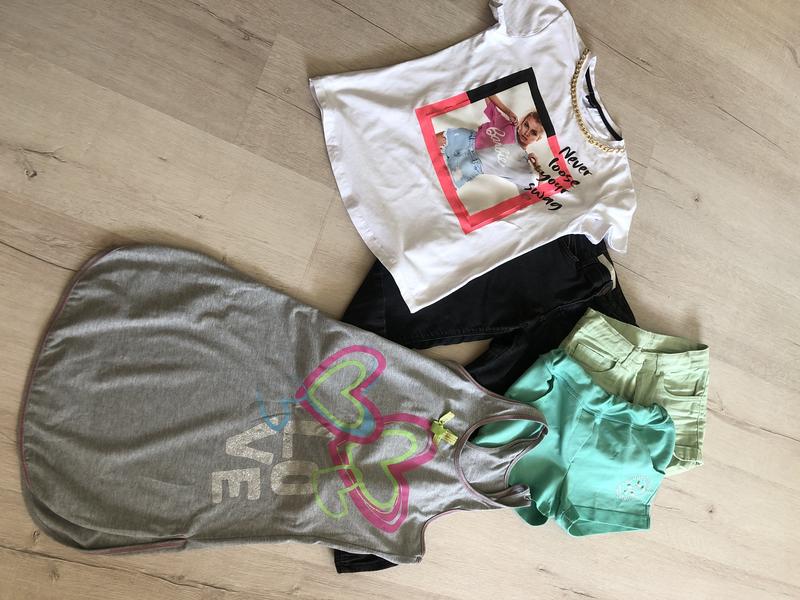 Джинси ПОТ 29 Довжина 92 Футболка ПОГ 39 Довжина 54 стан ідеальний Шорти салатові ПОТ 31 Шорти зелені трикотажні ПОТ 30 - тянеться до 40 Сукня пляжна ПОГ 37 Довжина 84 Окремо не продається