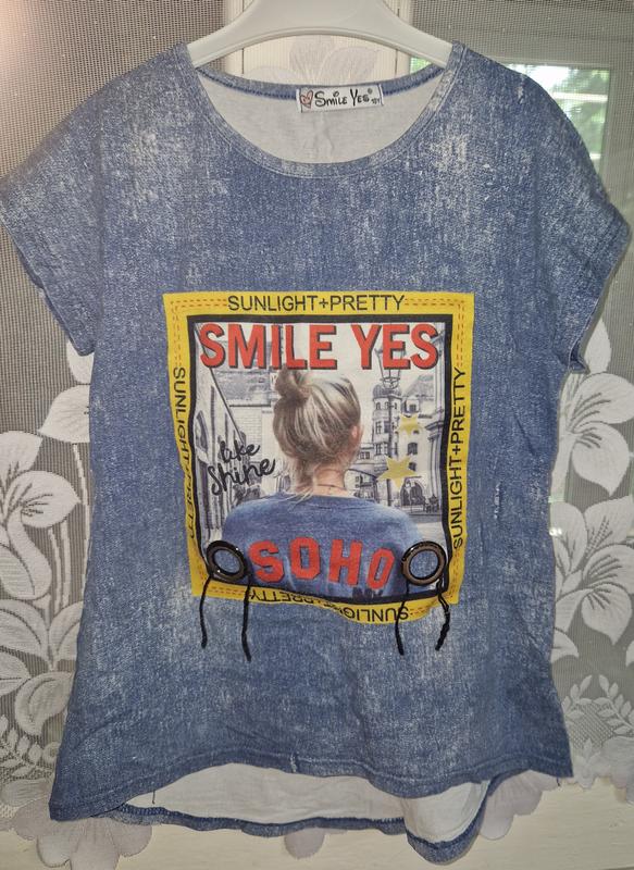 Сзади немного длинее. Цвет "варенный джинс". Качественная хлопковая вещь. ПоГ 34 Длина 49 /55