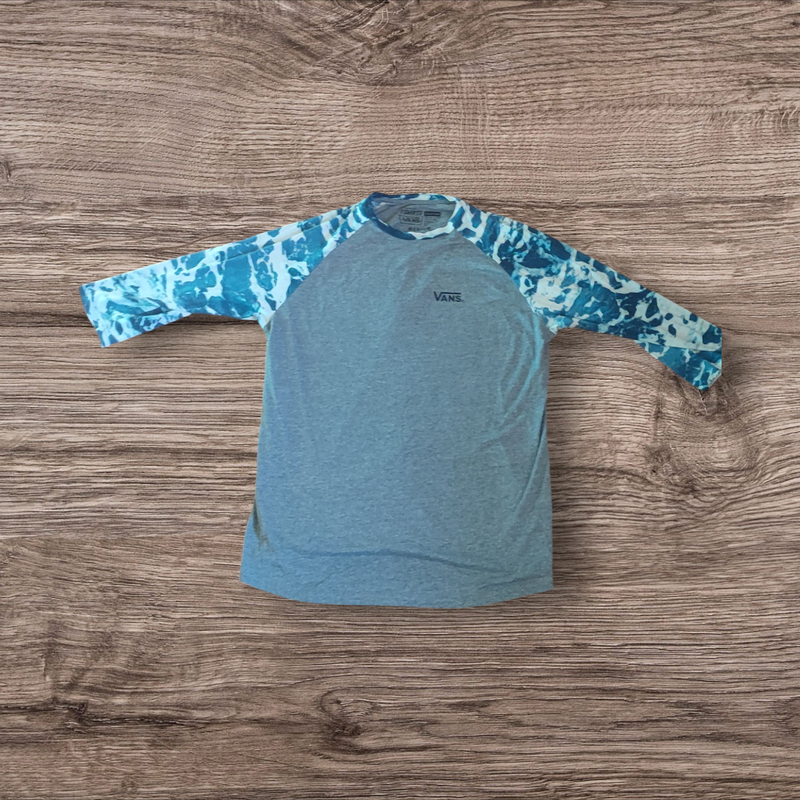 Оригінальний реглан Vans із довгим рукавом. Основна частина світло-блакитного/сірого кольору, а рукави виконані з яскравим принтом, що нагадує морські хвилі або піну в синьо-блакитних тонах.