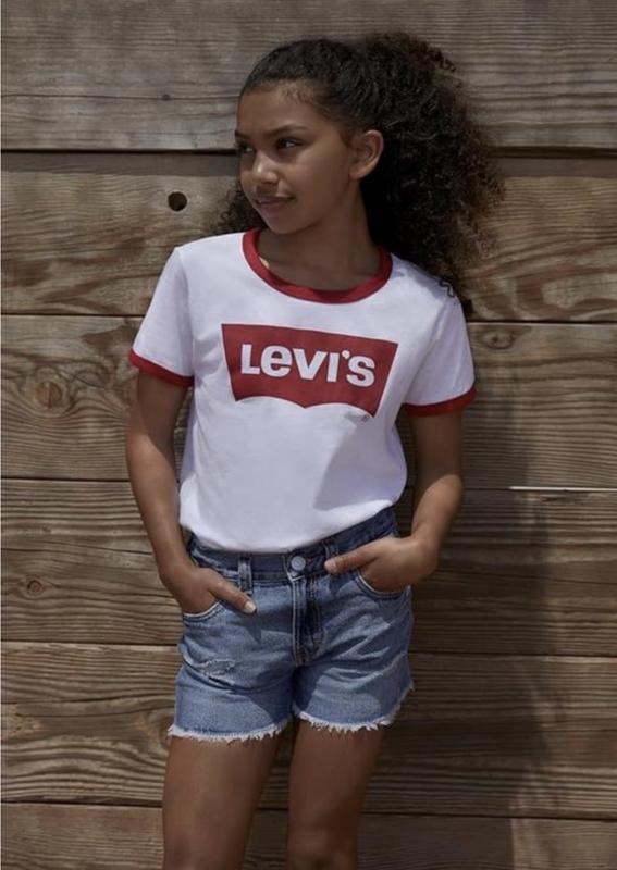 Фірмова футболка Levi’s з класичним логотипом Batwing. Оригінал. Модель з лінійки для дівчат, виконана з м’якої 100% бавовни, приємна до тіла та підходить для щоденного носіння. Якісний матеріал не витягується і добре тримає форму. Стильний спортивно-повсякденний дизайн, підходить під джинси, шорти та худі. Нова, з бірками. Підлітковий розмір L (12–13 років), рекомендований зріст 140–155 см. Колір білий.. Заміри: довжина 57 см, ширина під пахвами 44 см, ширина по талії 43 см. Плечі 37 см
