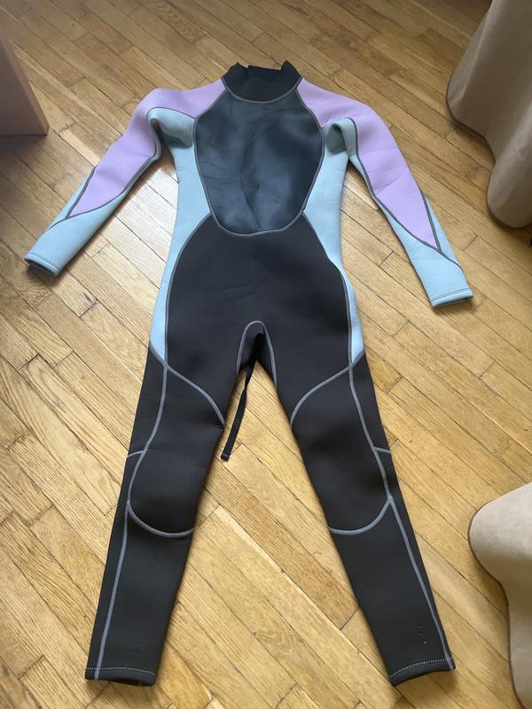 Зображений гідрокостюм - це модель від бренду Next, яка, ймовірно, призначена для дітей або підлітків. Основні характеристики: Матеріал: Виготовлений з неопрену, товщина якого зазвичай становить 3 мм. Захист: Забезпечує захист від сонячного ультрафіолету (UPF 50+), блокуючи понад 97.5% УФ-променів. Дизайн: Має довгі рукави та штанини (full-body style) з комбінацією кольорів, включаючи чорний, світло-блакитний та лавандовий/фіолетовий акценти. Шви на костюмі контрастного світлого кольору. Призначення: Підходить для плавання та водних видів спорту, забезпечуючи теплоізоляцію та захист від сонця. Цей тип гідрокостюма є популярним вибором для початківців або для використання в помірно теплій воді.