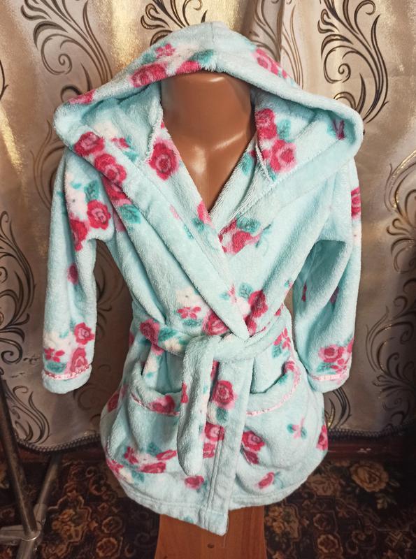 Теплый халат для девочки Marks & Spencer. Размер - 3-4 года. Замеры: плечи 31 см, ПОГ 36 см, ПОТ 33 см, ПОБ 38 см, длина рукава 34 см, длина 60 см. Ткань - велсофт. Состав: 100% полиэстер. В идеальном состоянии