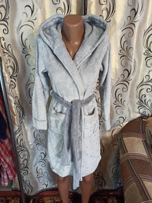 Теплий халат для підлітка Primark. Розмір - 11/12 років. Заміри: плечі 34 см, ПОГ 48 см, ПОТ 45 см, ПОБІДИ 49 см, довжина рукава 54,5 см, довжина 91 див. Тканина - велсофт. Склад: 100% поліестер. Пояс не рідний. В ідеальному стані