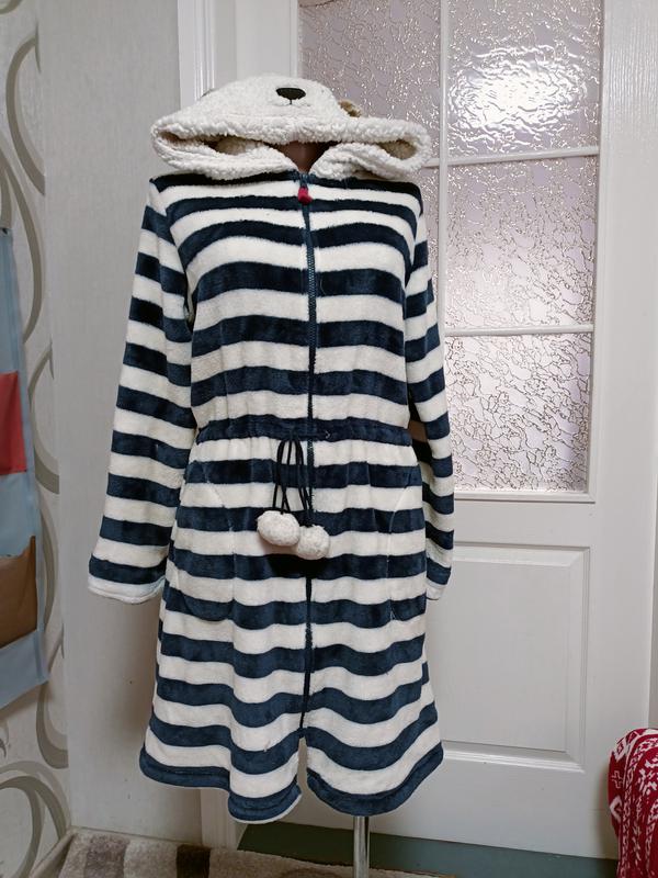 Халат в дуже хорошому стані. Розмір вказаний на 12-14 років. Тканина дуже тепла , приємна на дотик. На капішоні (Тедді) і шарики на зав'язках мають сліди носки. А сам халат у відмінному стані. ПОГ 57см Довжина 108см