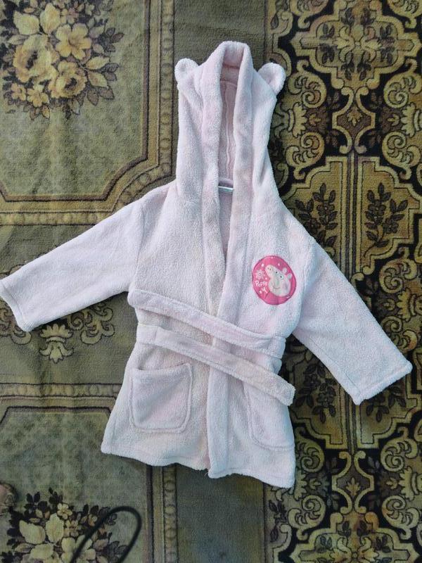 Прикольный детский девчачий банный халат с капюшоном с ушами.На ярлыке сохранились какие-то размеры. Смотрите сами.я в этих детских размерах не разбираются.На возраст где-то до 5 лет, приблизительно.Указания замеры:Ширина в плечах 28-29 см, пример.Длина рукавов сверху от плеч-30 см.Ширина в поясе,Посередине -27 см, ширина в самом низу-35 см, бличная высота халата вместе с капюшоном-77 см.Высота самого капюшона-28 см, ширина-17 см.Высота халата без капюшона-48 см.Халат б/в, вале идеально безупречном состоянии.Не пуговицы, ложные петельки для пуговиц нет.На поясе затягивается двумя боковыми пасочками вшитыми по бокам.Спереди снизу имеет два маленьких кармашка.Цвет светло-розовый.Халат махровый.Цена символичная.Отгладят безопасной оплатой через укрпочту только по пятницам.