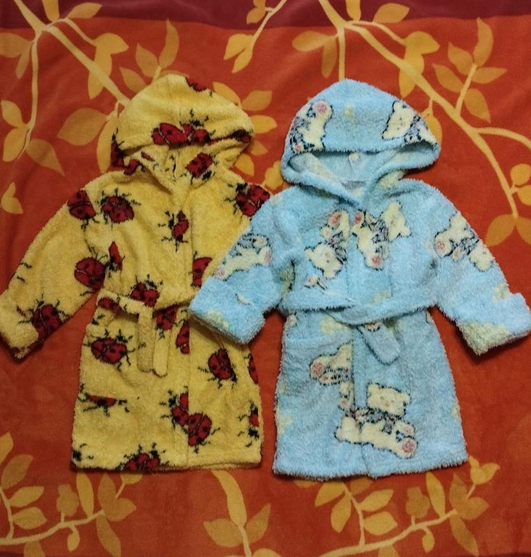 Милі махрові халатики з капюшоном під поясок.можна купити обидва або окремо.довжина-53 довжина рукава 28+манжет або закот-6 ширина від пахв —32.цена вказана за обидва.