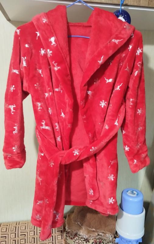 Гарний теплий червоний халатик із капюшоном для дівчинки 8-9 років. Вільного крою, на захід із поясом. Рукав із манжетою. У чудовому стані. Матеріал: двобічний поліестеровий фліс, прикрашений термоаплікацією у формі сніжинок і оленів. Одягався кілька разів. Заміри: ширина в плечах — 36 см, ширина в пахвах — 42 см довжина халата по спинці — 70 см см довжина рукава — 43 см.