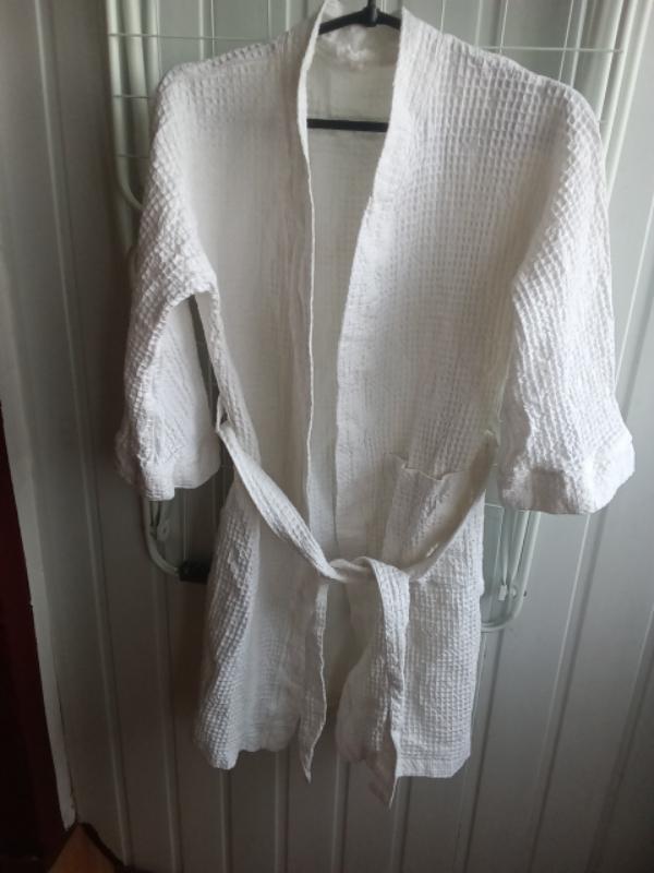 халат для дівчинки розмір S, колір білий.Довжина по спинці 85 см, реглан для дівчинки.55 см пояс завдовжки.170 см, одна накладна кишеня, тканина бавовна. Відправлю Укріплегою, НП, доставкою, накладки немає.