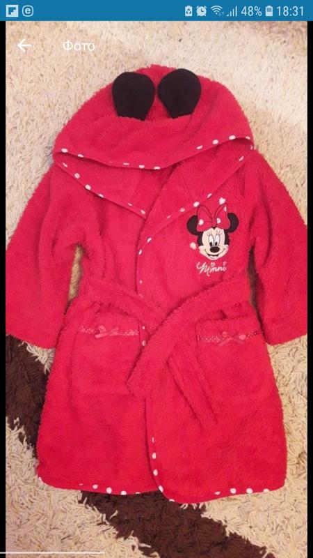 Дитячий махровий халатик з вушками Мікі,фірми Disney.З заду поясочок на ризиночці .Стан ідеальний, розмір 2-3 роки,92-98 див. Довжина 60 см ПОГ 38см.Довжина рукава від плеча 30см.