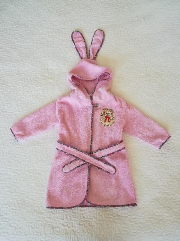 Махровий халатик рожевого кольору. На спинці вшита резиночка. Зав'язується на поясок, зверху гудзичок.