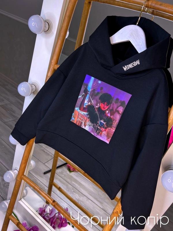 Стильне худі з улюленою Wednesday тканина 2нитка худі з капюшоном, на рукавчиках є манжет, 🪴прикрашене подвійним прогумованим накатом рекомендую!!! розмір/🪴довжина/пог/рукав від горловини 134/🪴44/44/55-2шт 140/🪴45/46/56-2шт 146/🪴46/48/58-2шт 152/🪴49/50/59-1шт 158/🪴53/52/61-2шт +-2см