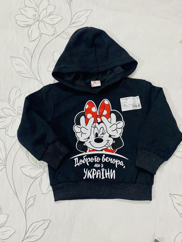 Однотонне худі з капюшоном, виготовлене для дівчаток молодшого віку. Прямі лінії крою, оптимальна довжина до середини лінії стегна ідеально поєднуються з якістю матеріалу та палітрою кольорів. У ньому тепло, затишно та комфортно. Передня частина виробу прикрашена патріотичним малюнком, а зрізи рукавів та низу виробу оброблені еластичним матеріалом у основний тон. Худі виготовлено з трикотажного полотна – начісного футера, основою якого є 100% бавовна. Лицьова сторона матеріалу гладка, схожа на кулірне переплетення, виворіт полотна має невеликий м'який ворс. Плюсами футера є висока щільність, гігроскопічність та повітропроникність. Через натуральну основу матеріал можна вважати екологічним та гіпоалергенним. Є деякі негативні моменти – матерія погано реагує на вплив прямих сонячних променів та високих температур під час прання. Тому, щоб виріб не дав усадку, прати його рекомендують за температури не вище 30-40°С. Через наявність накату прасувати виріб рекомендується з виворітного боку із застосуванням парогенератора.