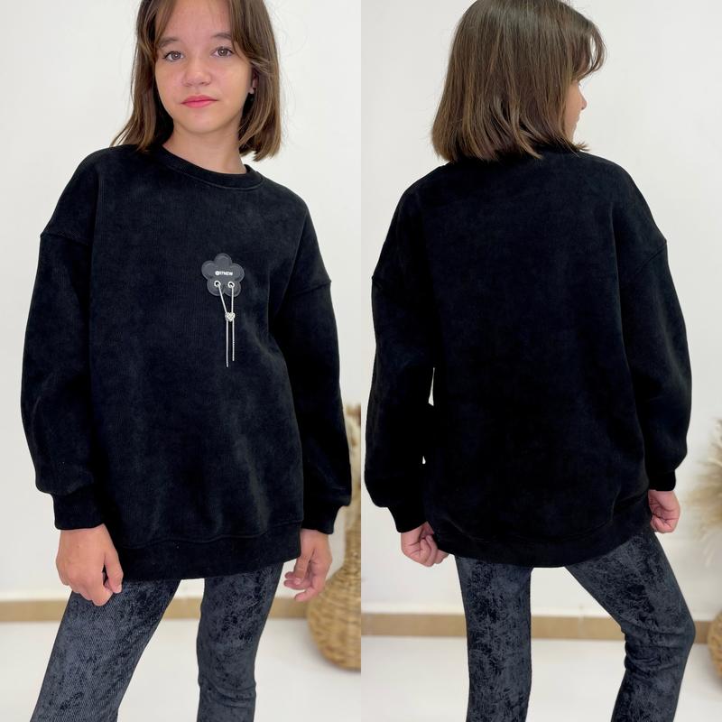Гарний світшот Тканина мікро-вельвет дуже гарної якості на флісі щільний, дуже теплий та приємний до тіла колір чорний СУПЕР ЯКІСТЬ! зріст/довжина/пог/рукав від горловини похибка +-2см 140/58/48/56-1шт 152/60/53/59-2шт 164/64/57/68-1шт
