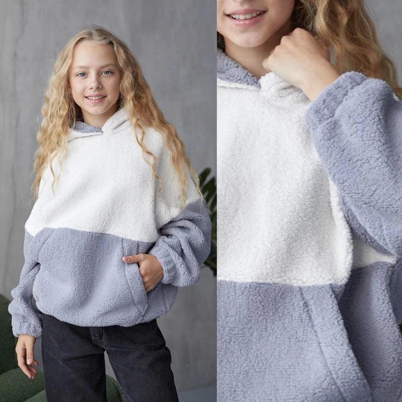 Таня арт 3754 Теплий худі з подвійним капюшоном є кишеня тканина плюш-травка дуже м'який РЕКОМЕНДУЮ! зріст/довжина/пог/рукав від горловини похибка+-2см 128/54/48/55-1шт 134/57/50/56-1шт 140/58/52/59-1шт