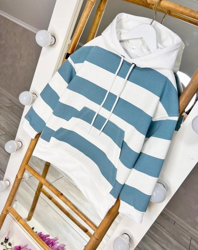 Стильне худі з кишенею кенгуру та подвійний обємний капюшон на шнурівці трендова полоска ти відмінна якість Турецька трьохнитка петля!!! Заміри : довжина/рукав від горловини/пог 146-58/58/49 Аб