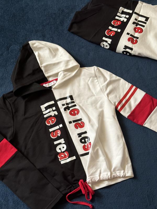 Сучасний двоколорний худі на завʼязці знизу✨ Підійде на теплу осінь-весну В наявності 2 розміри: 12 років (152см); 13років(158см). Заміри на 152см: Довжина рукава 53,5см Ширина по спині під руками 44,5см Загальна довжина (без урахування капюшону) 46,5см Заміри на 158см: Довжина рукава 57,5см Ширина під руками по спині 46,5см Загальна довжина 50см Склад: 95% бавовна та 5% еластан Виробник Турція