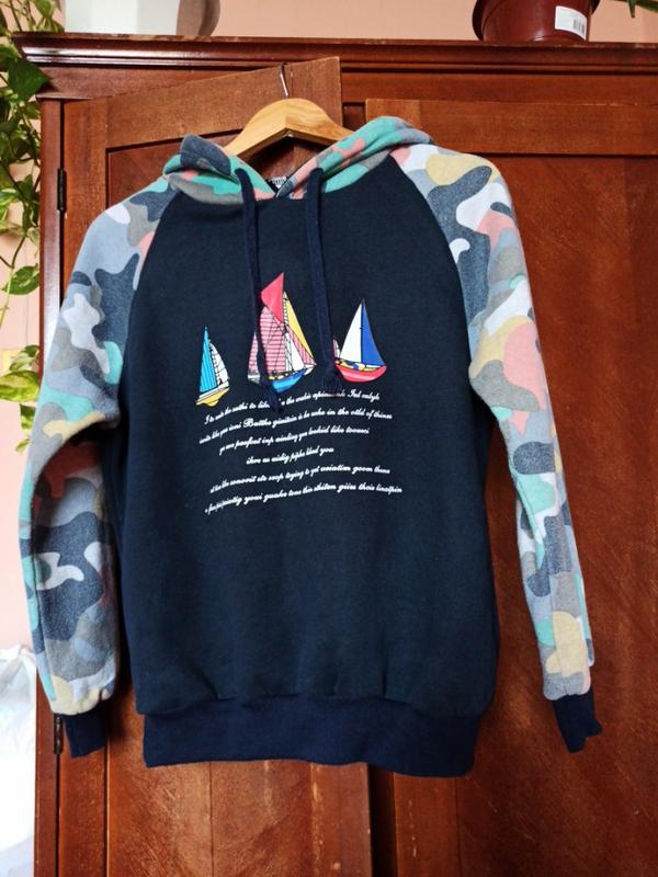 Худі унісекс Розмір XS,S Рукави та капюшон різнокольорові,перед декорований морською тематикою Тканина бавовна 💯 з утепленням,рукава та капюшон утеплені додатково Річ власна ,не секонхенд 👆 В ідеальному стані Дуже тепле.Можна носити самостійно,із жилеткою чи курткою . Є заміри на останньому фото Відповім на всі запитання,зроблю додаткові фото 🔎