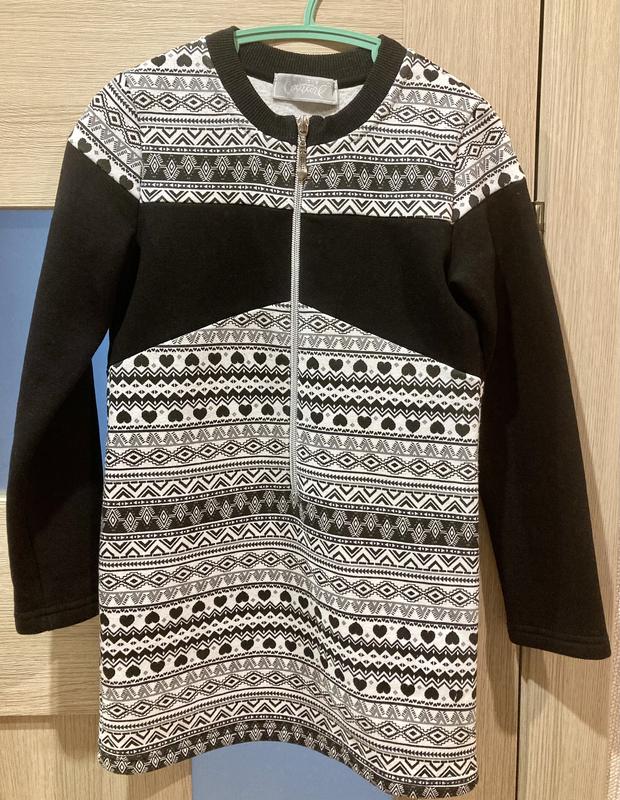 Тепла туніка з начосом в середині. Можна носити, як плаття. По бірці зріст 134 см. Заміри: плечі - 28 см, рукава - 46 см, пог - 32 см, довжина по спині - 60 см.