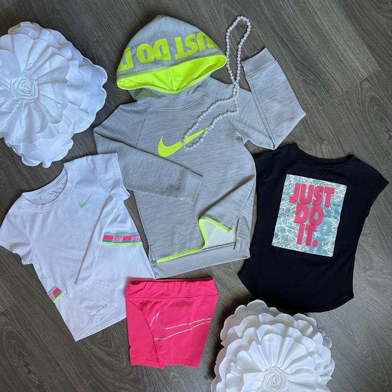 Продам комплект дитячих речей для дівчинки (оригінал, купувала в США) Розмір: 104-110 см/4-5 років Бренд: Nike Dri-fit Кількість речей: 4 одиниці * худі на щільній флісовій підкладці, тепла, з розрізами по боках, великим каптуром * футболка чорна, базова бавовна * футболка біла/нейлон Dri-fit, вільний крій * шорти/велосипедки/нейлон Dri-fit Стан, ідеал (худі+чорна футболка) Біла футболка+шорти - в ПОДАРУНОК!!! бо мають сліди носки (фото відправлю) За потреби надам більше фото і заміри речей зі всією додатковою інформацією Відправлю в будь який зручний для вас спосіб Дивіться інші моі об’яви Розпродаємо речі всієї сім’ї у звязку з від’їздом (жіночі/чоловічі/дитячі)