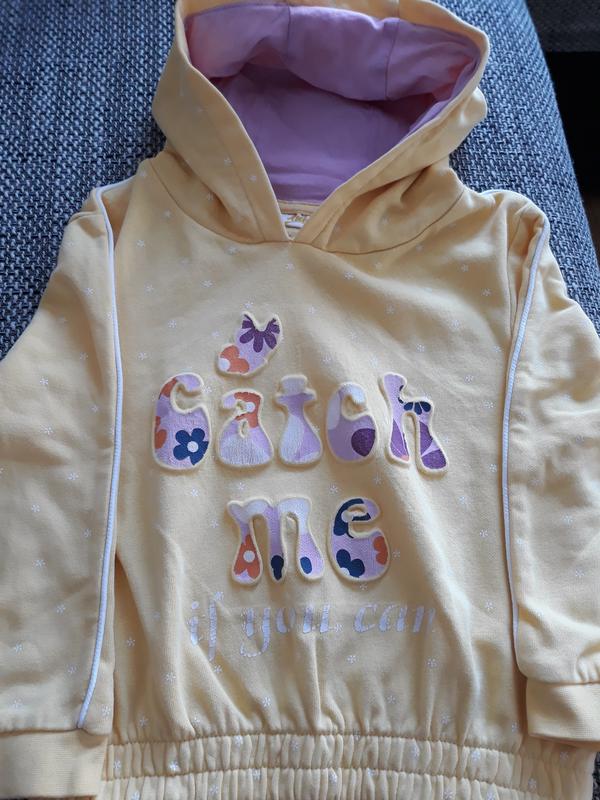 Веселе худі з каптуром.Каптур всередині рожевого кольору.Худі тепленьке.Загальна довжина 36см.Низ на широкій гумці.