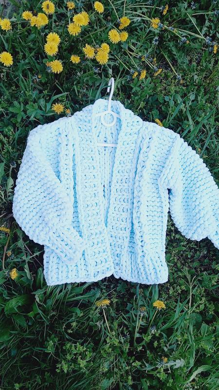Новий.Зв'язаний з плюшевої,гіпоалергенної пряжі.М'який ніби хмаринка.Не кошлатиться,не електризується.Розмір 116.Колір ніжно блакитний.