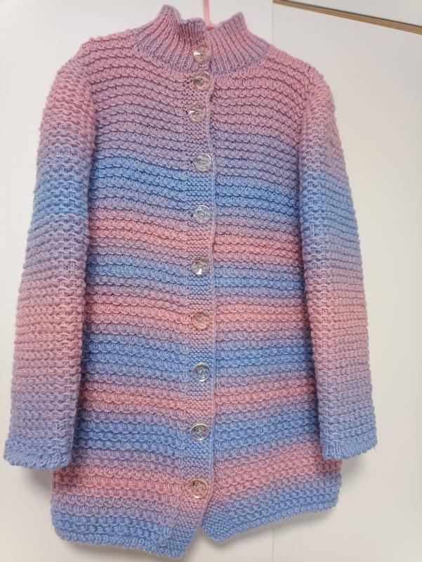Теплий в'язаний кардиган для дівчинки. Можна одягати як верхній одяг в прохолодну погоду. Ручна робота. Довжина рукава від горловини-54, від плеча -45см, довжина виробу-61 см. ширина в плечах-33, під ручками-42