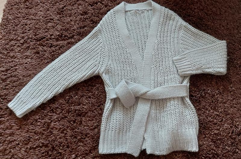 Теплый кардиган, светло-серого цвета, размер 140. Плечи опущены, поэтому замеры рукава от горловины 60, ширина изделия 43, длина 63. Полупояс можно завязывать спереди, чтобы зафиксировать, или сзади для красоты. Дефектов нет.